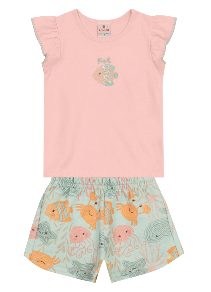 Conjunto infantil menina com blusa em meia malha com bordado com paetê temático e shorts em moletinho de estampa similar com cós elástico.