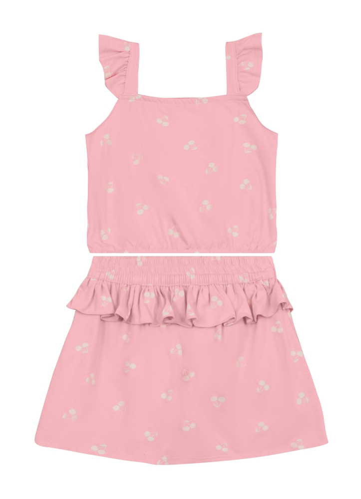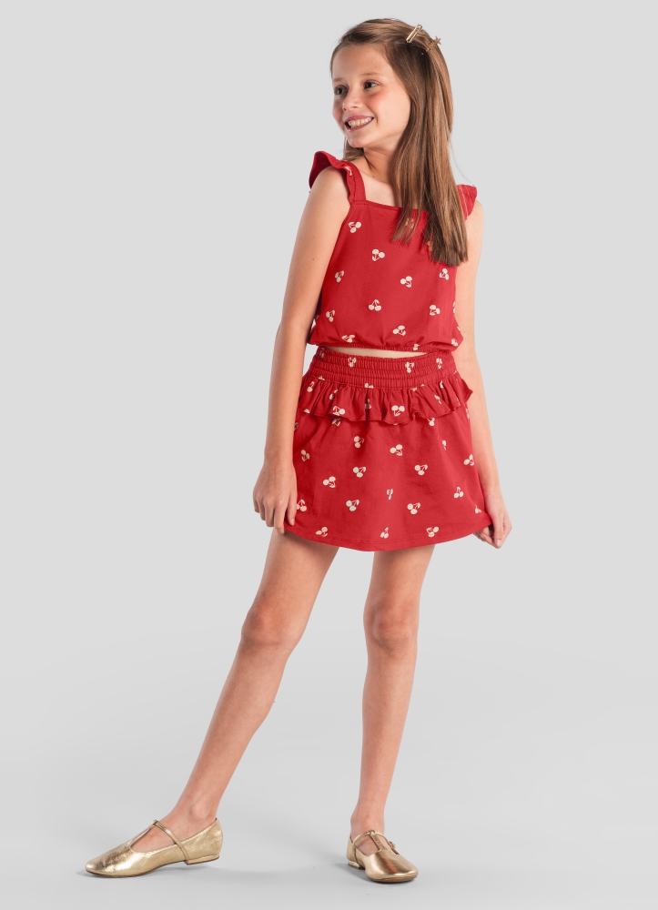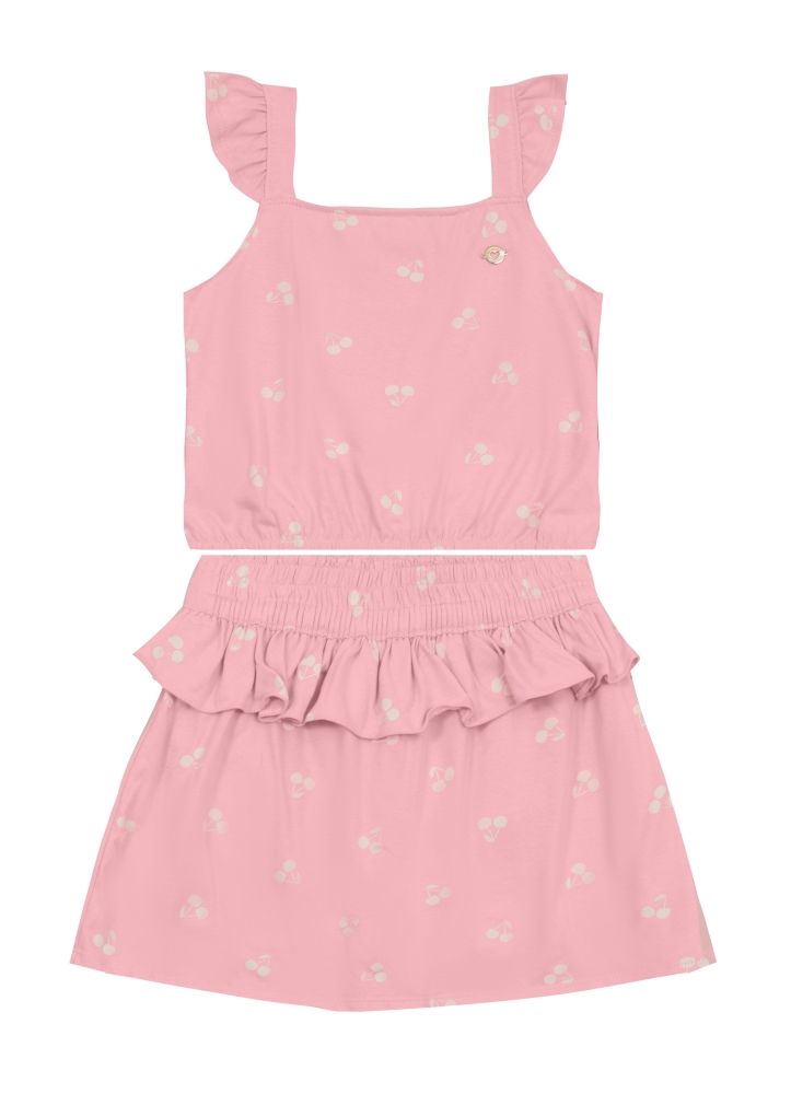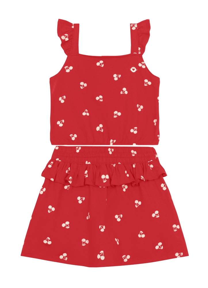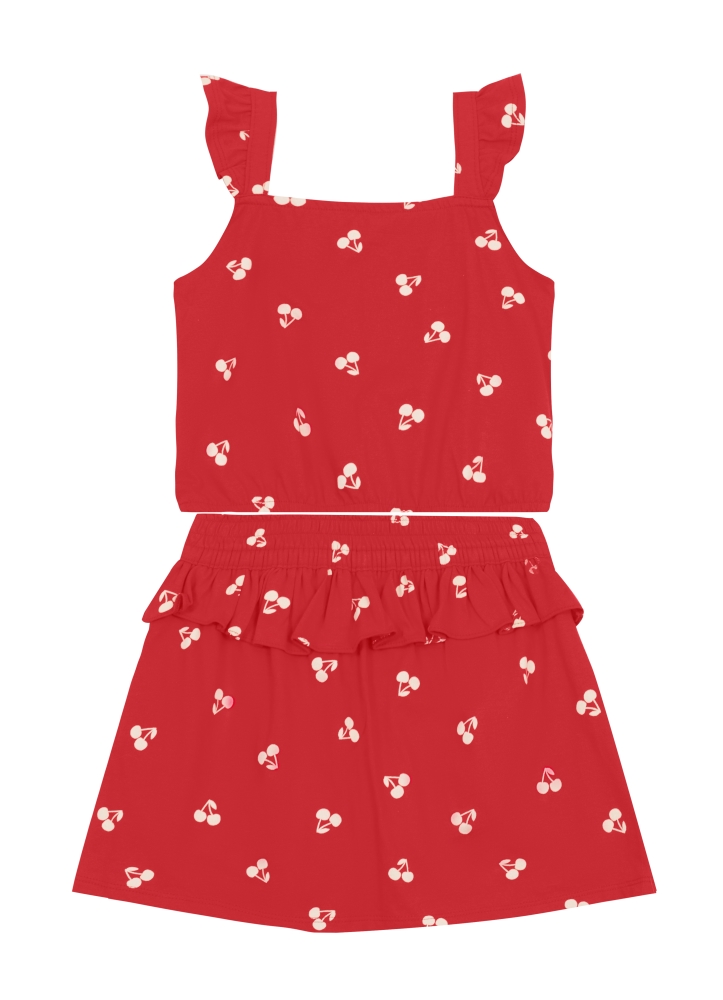 Conjunto infantil menina em meia malha com blusa cropped com estampa de cerejas e decote quadrado, junto a um shorts saia de mesma estampa com cós elástico e babados.