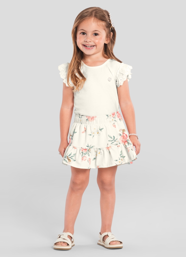 Conjunto infantil menina em cotton composto por blusa de cor lisa e mangas com detalhe em renda guipir. Shorts saia estampado floral com cós elástico e pregas dando efeito rodado.