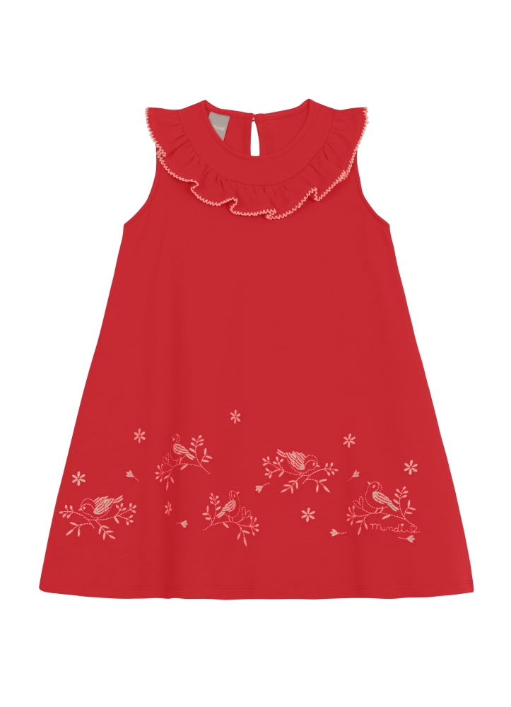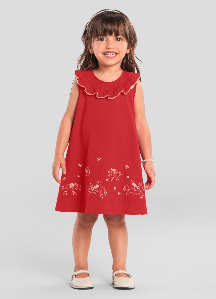 Vestido infantil menina confeccionado em cotton com bordado delicado de passarinhos, gola detalhada em babado e manga modelagem regata. Ofereça exclusividade e sofisticação em cada peça e torne sua loja a preferida das famílias!